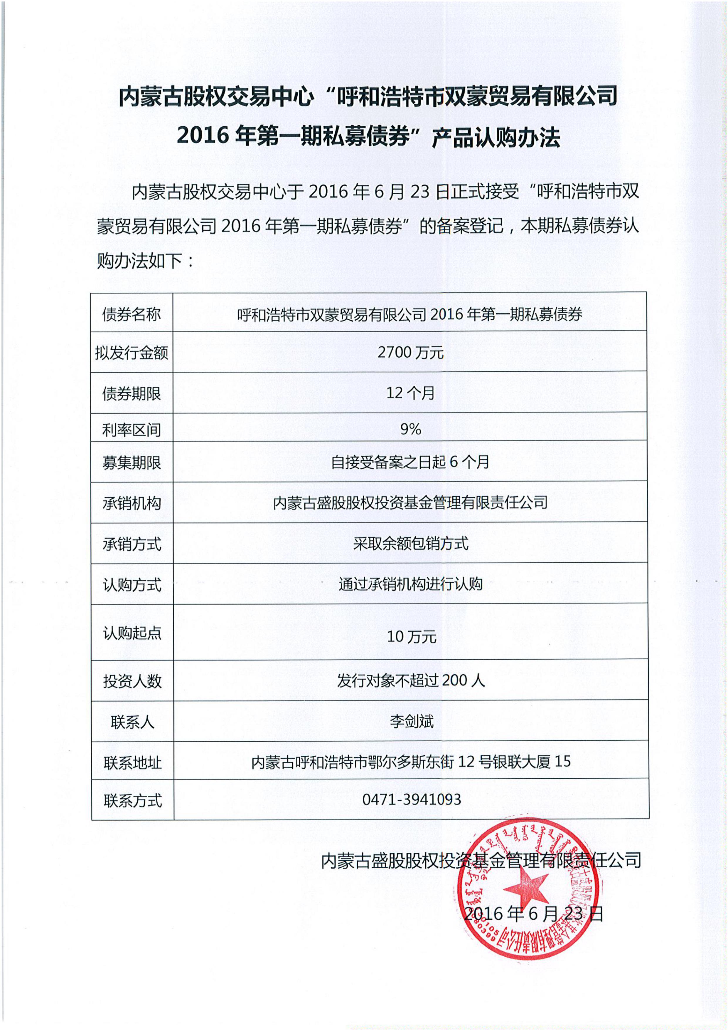 内蒙古股权交易中心“呼和浩特市双蒙贸易有限公司2016年第一期私募债券”产品认购办法
