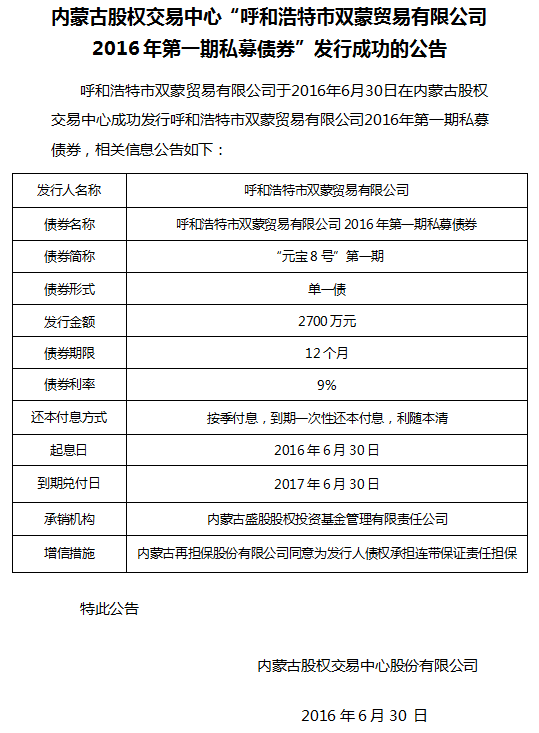 内蒙古股权交易中心“呼和浩特市双蒙贸易有限公司2016年第一期私募债券”发行成功的公告