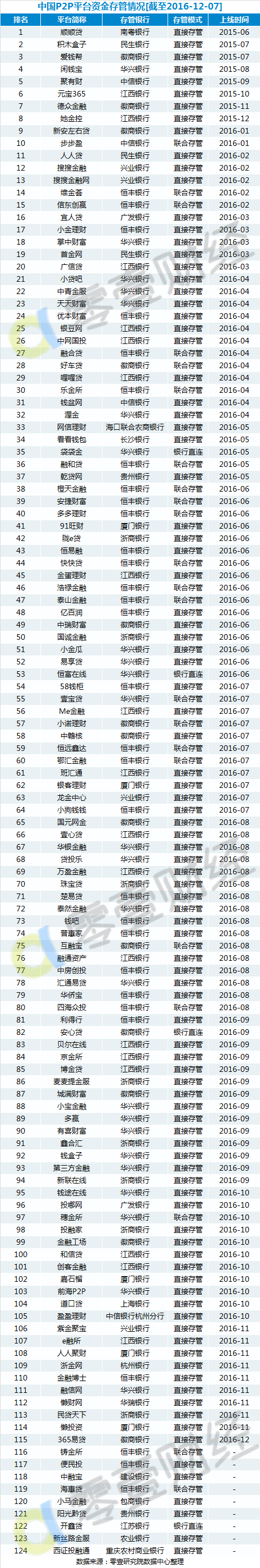 最新P2P平台银行存管名单:共124家 仅占正常运营平台7.7%