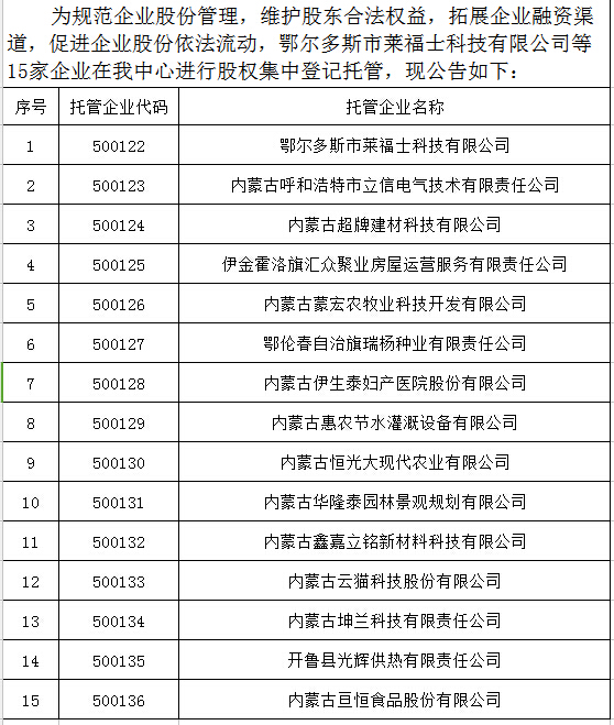 鄂尔多斯市莱福士科技有限公司等15家企业股权登记托管的公告