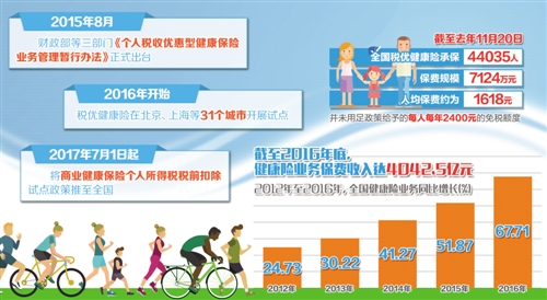 据公开信息,2012年至2016年,健康险业务同比增长分别为24.73%、30.22%、41.27%、51.87%和67.71%,连续五年大幅超过其他险种。截至2016年底,健康险业务保费收入达4042.5亿元。相形之下,税优健康险占据市场份额的确很小,但长期看,随着商业健康险发展进一步扩大,税优健康险必将迎来一片蓝海。