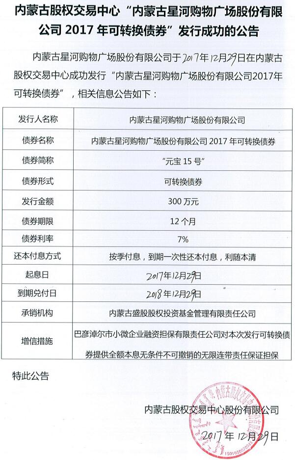 内蒙古股权交易中心“内蒙古星河购物广场股份有限公司2017年可转换债券“发行成功公告