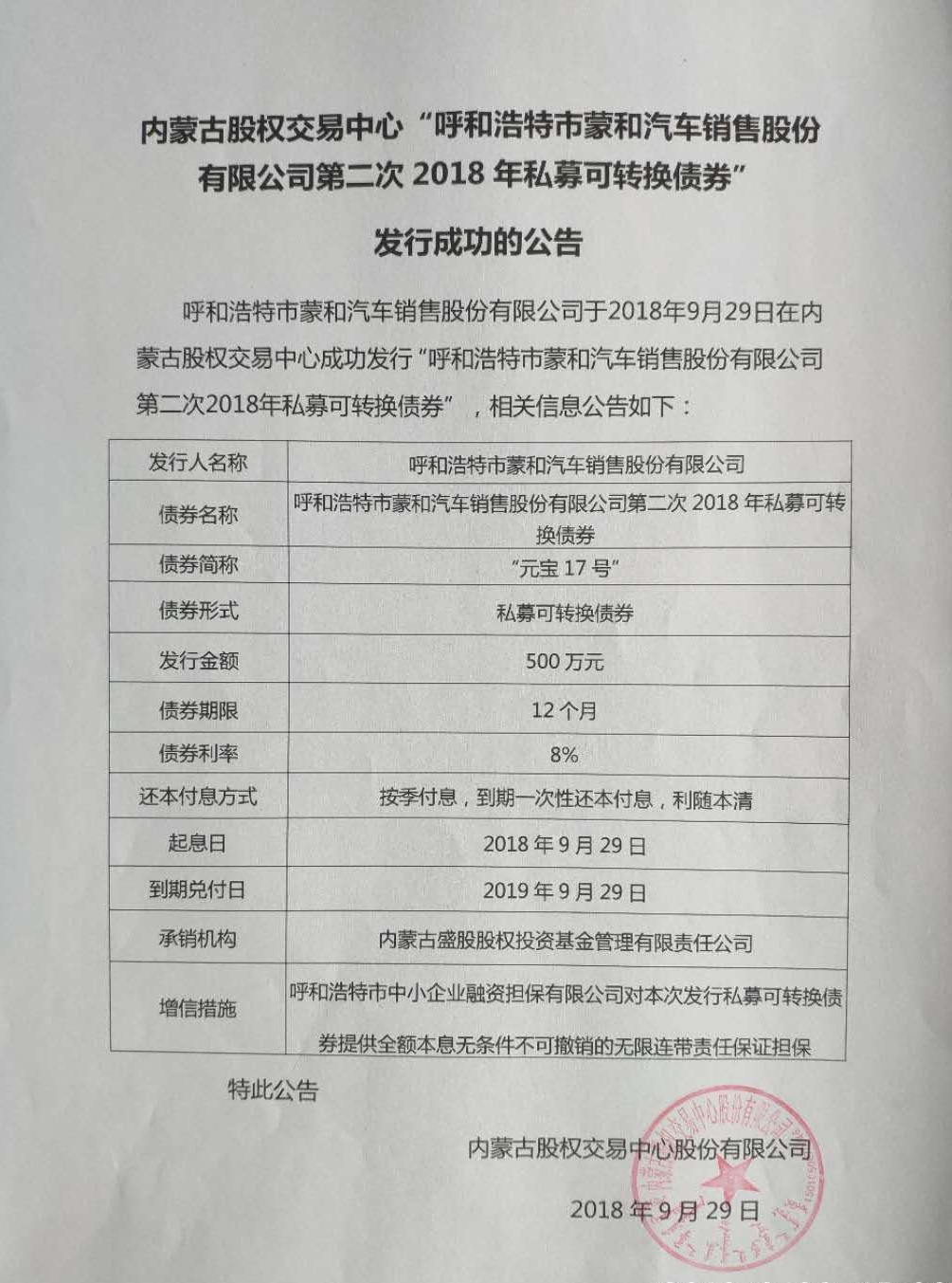 内蒙古股权交易中心“呼和浩特市蒙和汽车销售股份有限公司第二次2018年私募可转换债券”发行成功的公告