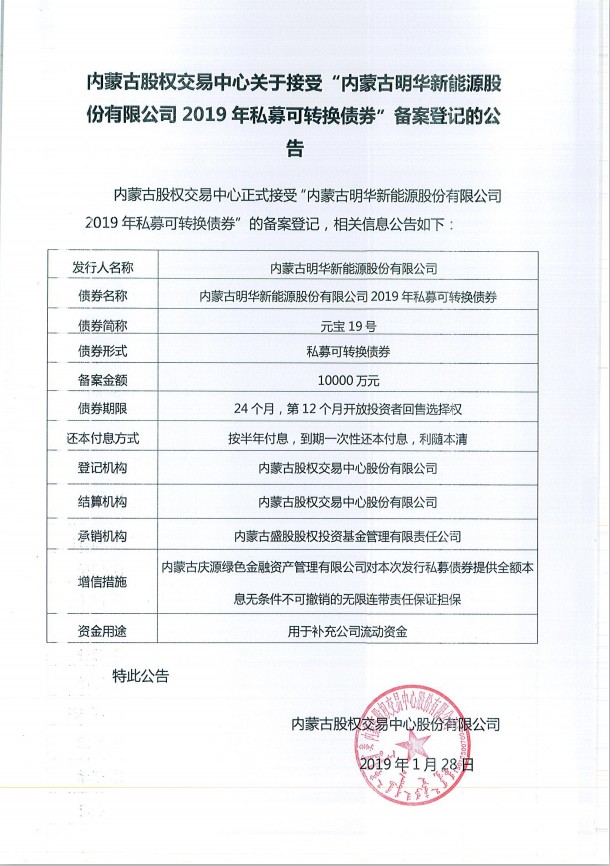 内蒙古股权交易中心关于接受“内蒙古明华新能源股份有限公司2019年私募可转换债券”备案登记的公告