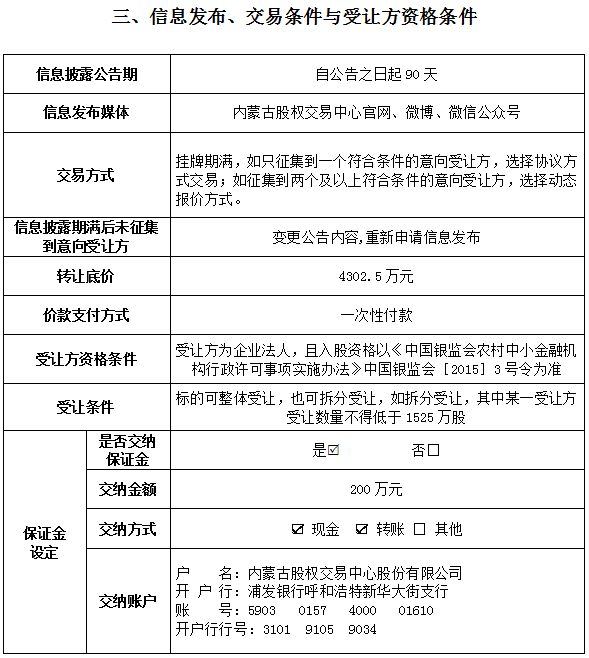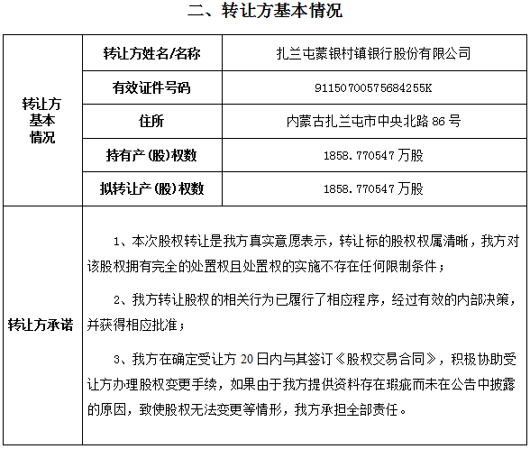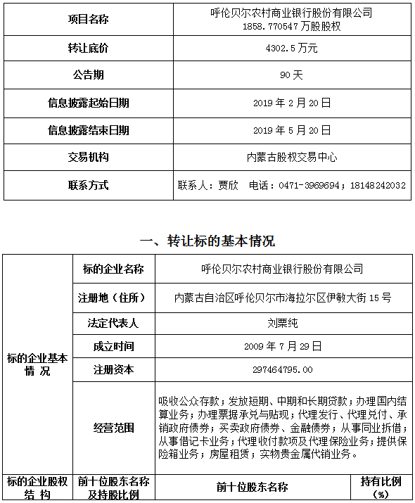 呼伦贝尔农村商业银行股份有限公司部分股权转让公告