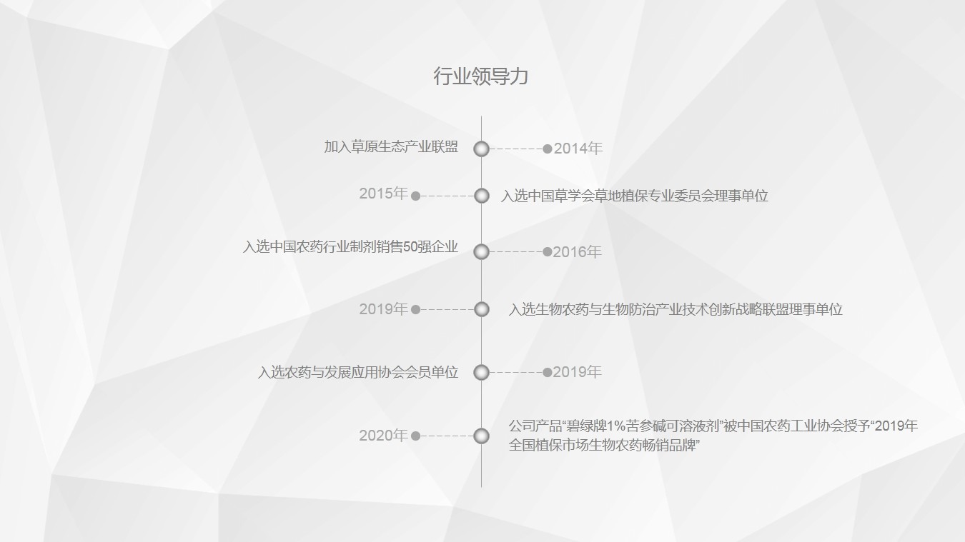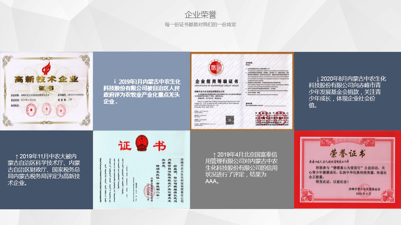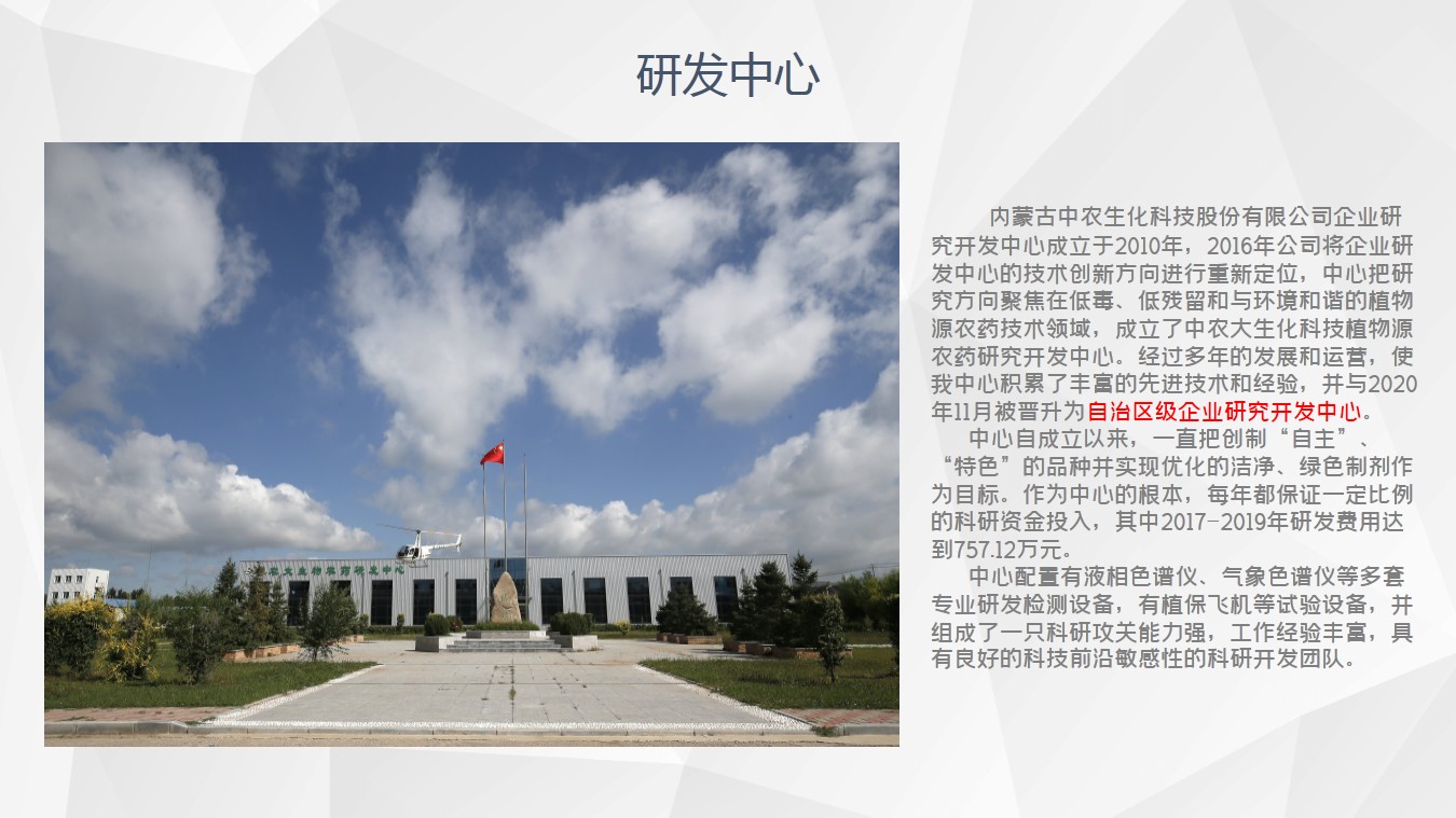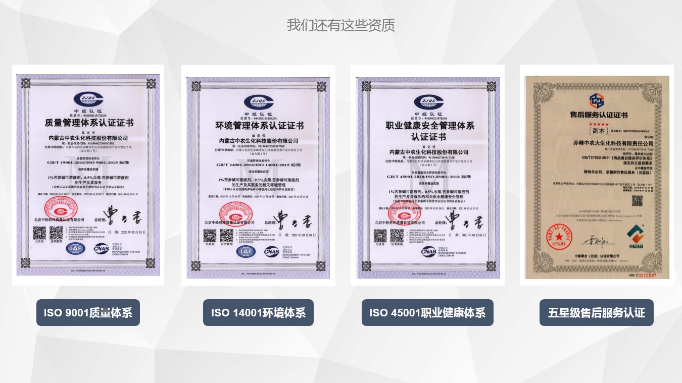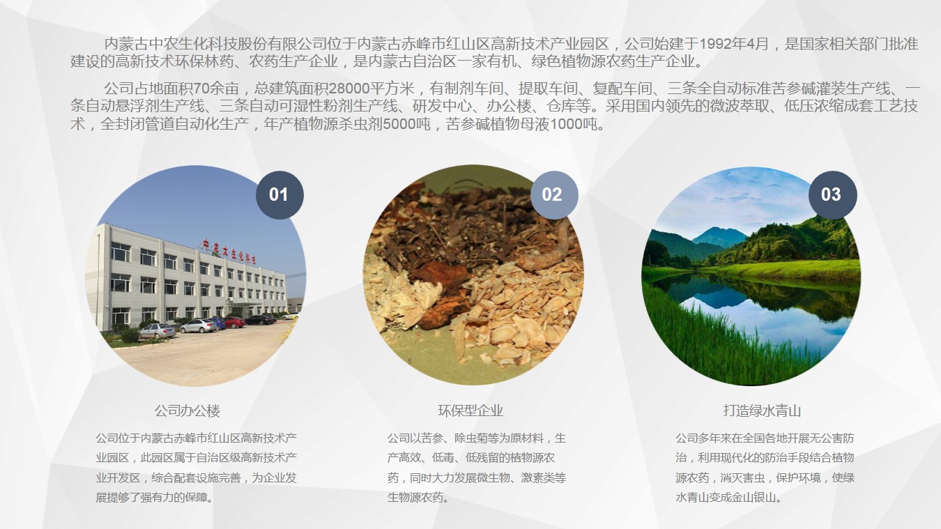 1、内蒙古中农生化科技股份有限公司致力于低毒、低残留、与环境和谐的植物源农药的生产和研发。公司是自治区农牧业产业化重点龙头、高新技术企业。