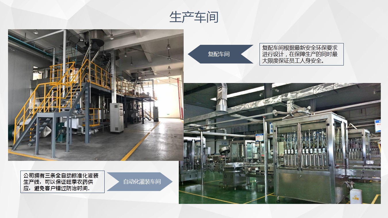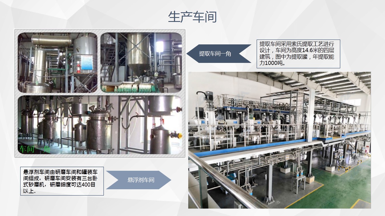 3、公司占地面积70余亩,总建筑面积28000平方米,有制剂车间、提取车间、复配车间、三条全自动标准苦参碱灌装生产线、一条自动悬浮剂生产线、三条自动可湿性粉剂生产线。公司采用国内领先的微波萃取、低压浓缩成套工艺技术,全封闭管道自动化生产,年产植物源杀虫剂5000吨,苦参碱植物母液1000吨。