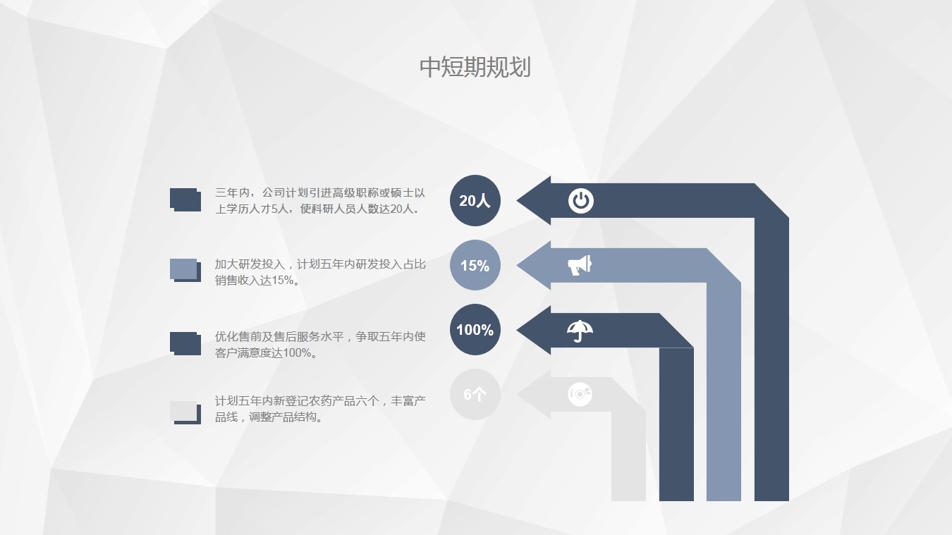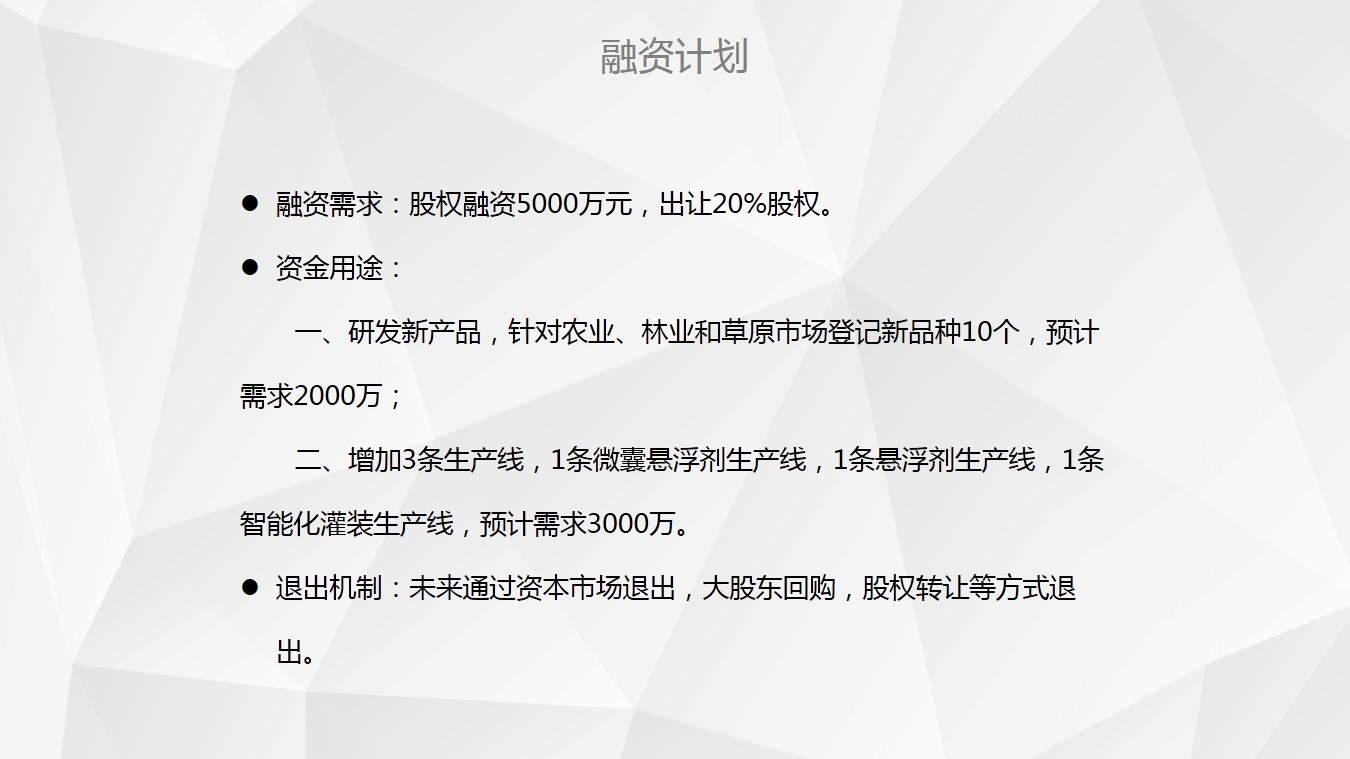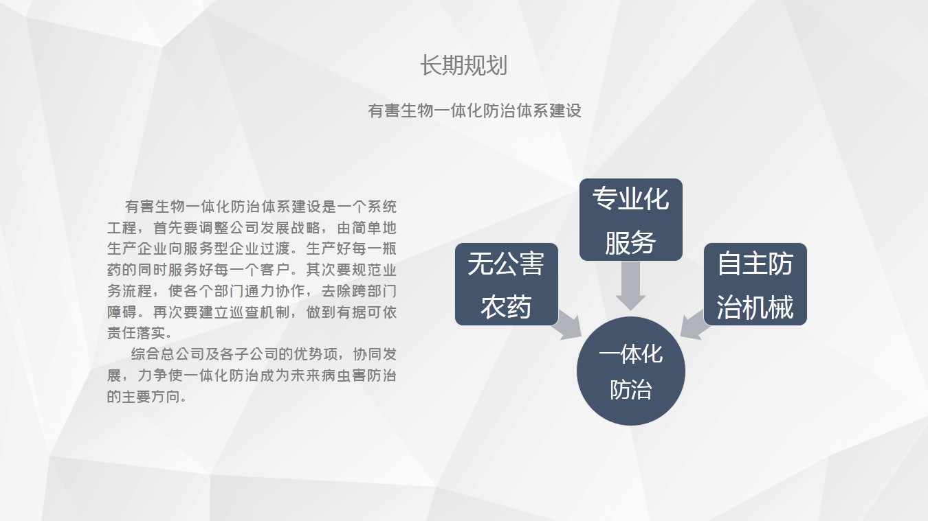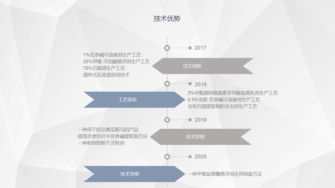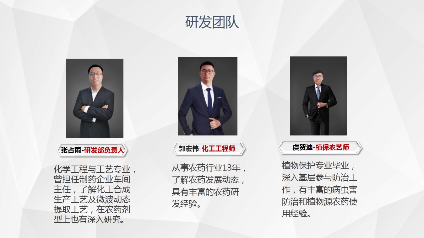 二、大胆的加大研发,中国是农药大国,未来低污染无污染的农药一定是大方向;多与一些行业大公司合作,找准定位,找到差距会促进企业快速、高质量发展;技术人员、市场推广服务团队多增加学习培训频率。