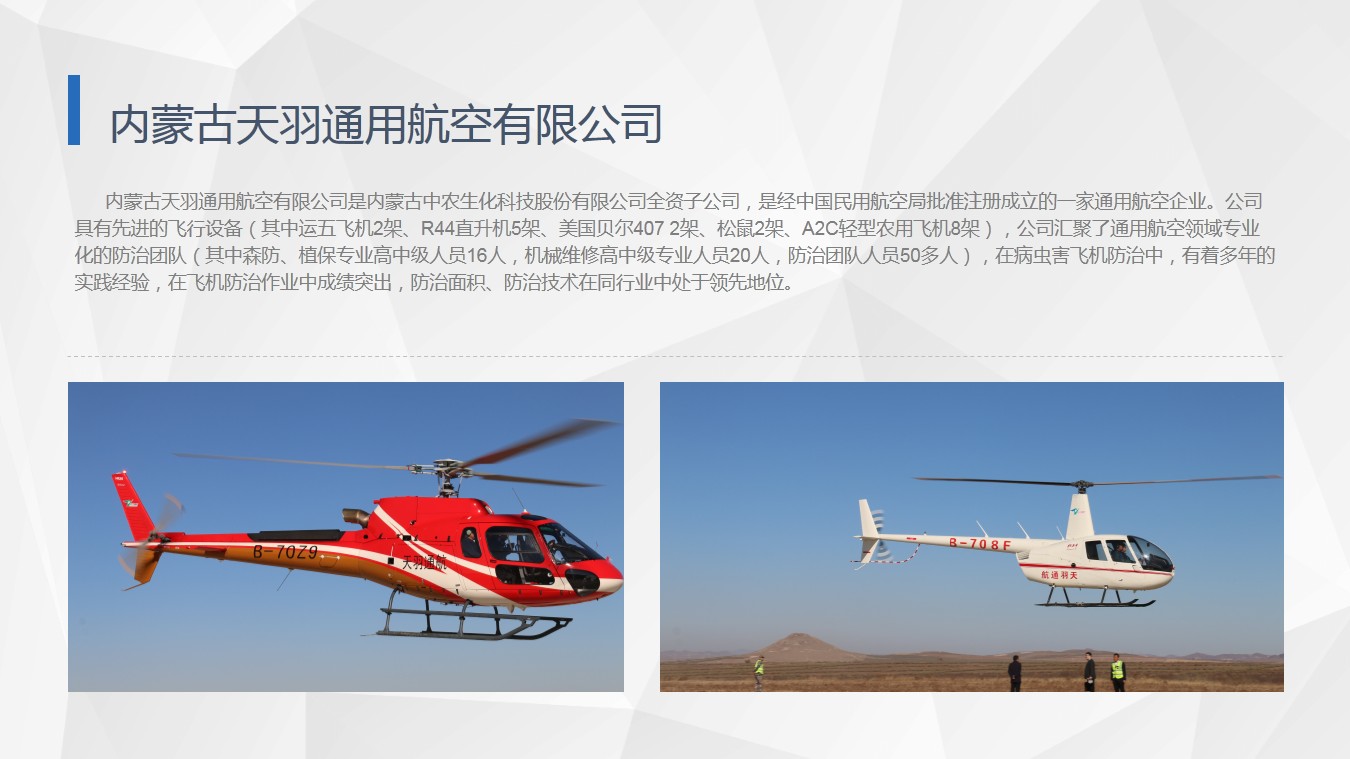 回答:通航公司业务与中农公司在业务上有着紧密的关联,主要体现在虫害防治中。子公司的成立实现了病虫害防治一体化社会服务。航空公司和农药销售起到互相推动的作用。就目前国内市场来看,我公司农药生产销售结合飞机防治一体化尚属唯一一家。