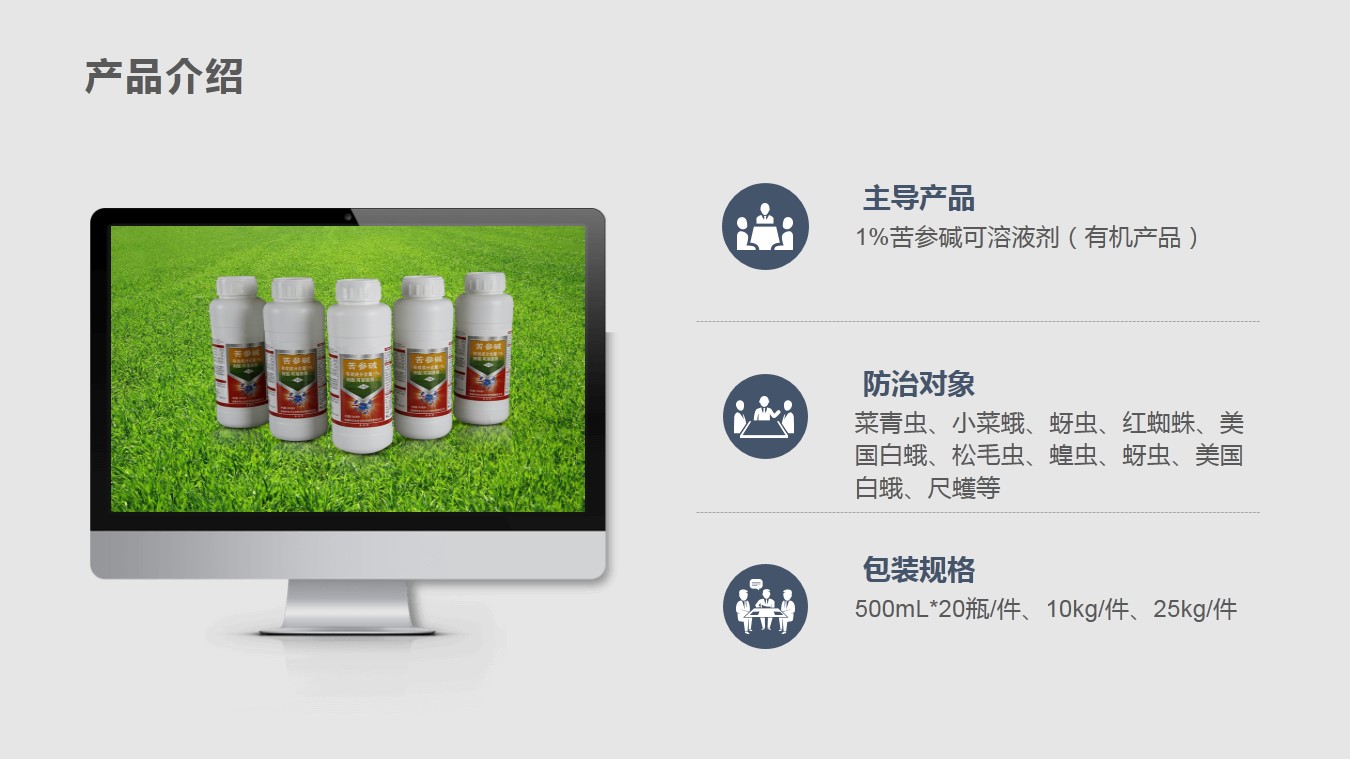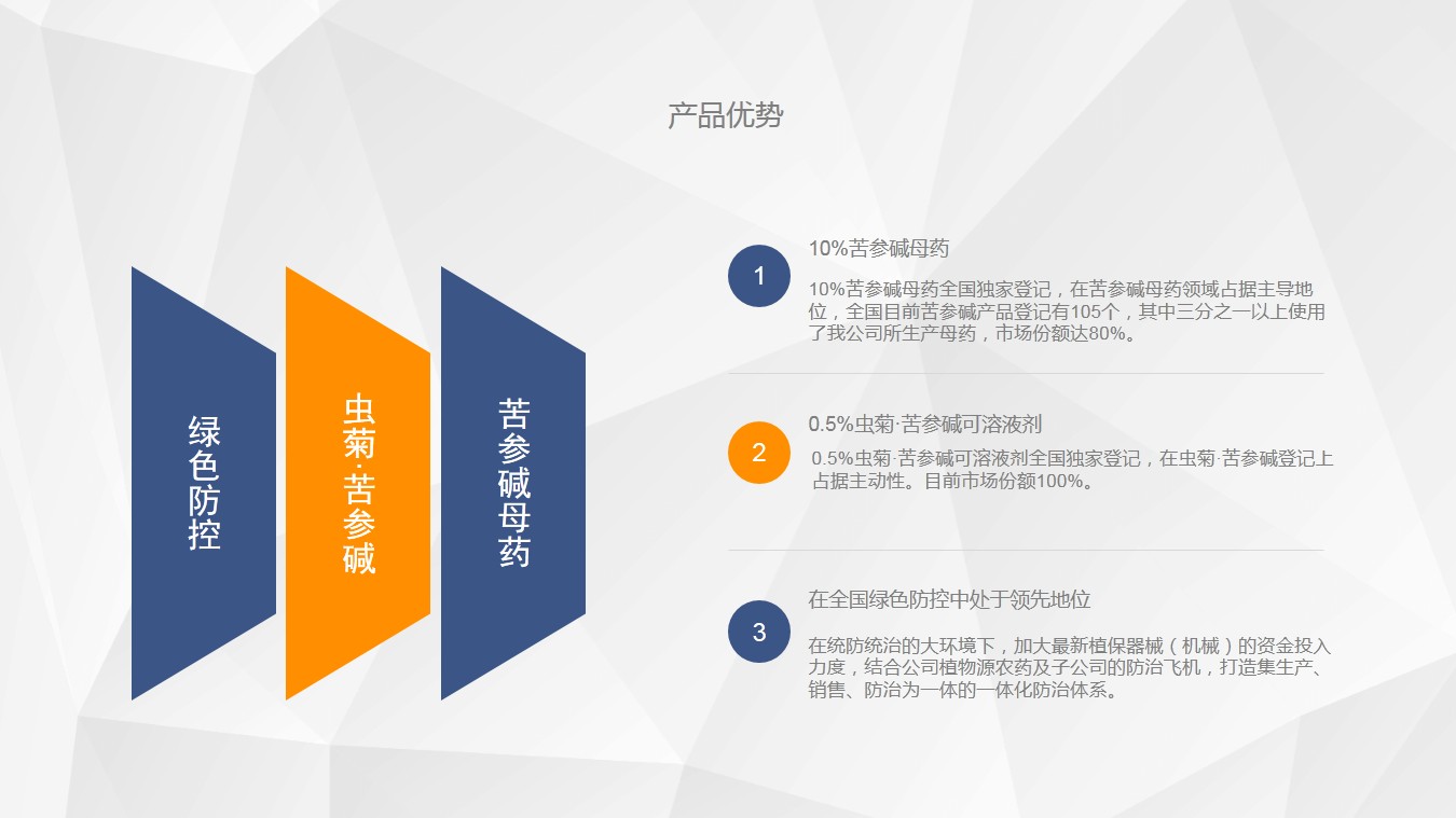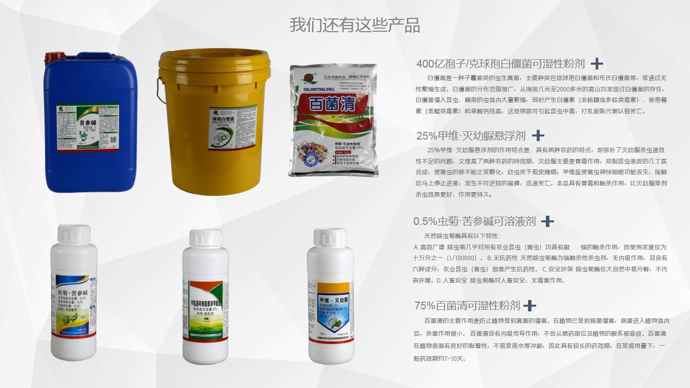5、全国目前苦参碱产品登记有105个,其中三分之一以上使用公司的产品10%苦参碱母药,市场份额达80%。
