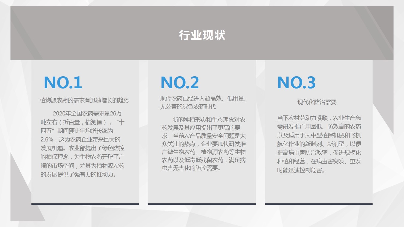 一、植物源农药对比传统化学农药在成本上的劣势需经过相对清晰的市场定位与定力来解决,这需要不断持续的市场教育换得,因此需加大营销投入,适度下降毛利率换市场快增长;SKU偏少、应加快研发形成产品线,满足不同需求以增加市场份额及影响力;在定位是以母药还是终端药为公司未来短期核心业务上重新规划一下,过去三年的营收变化不大,说明不是战略上就是营销上进入了瓶颈期,应重点审视。