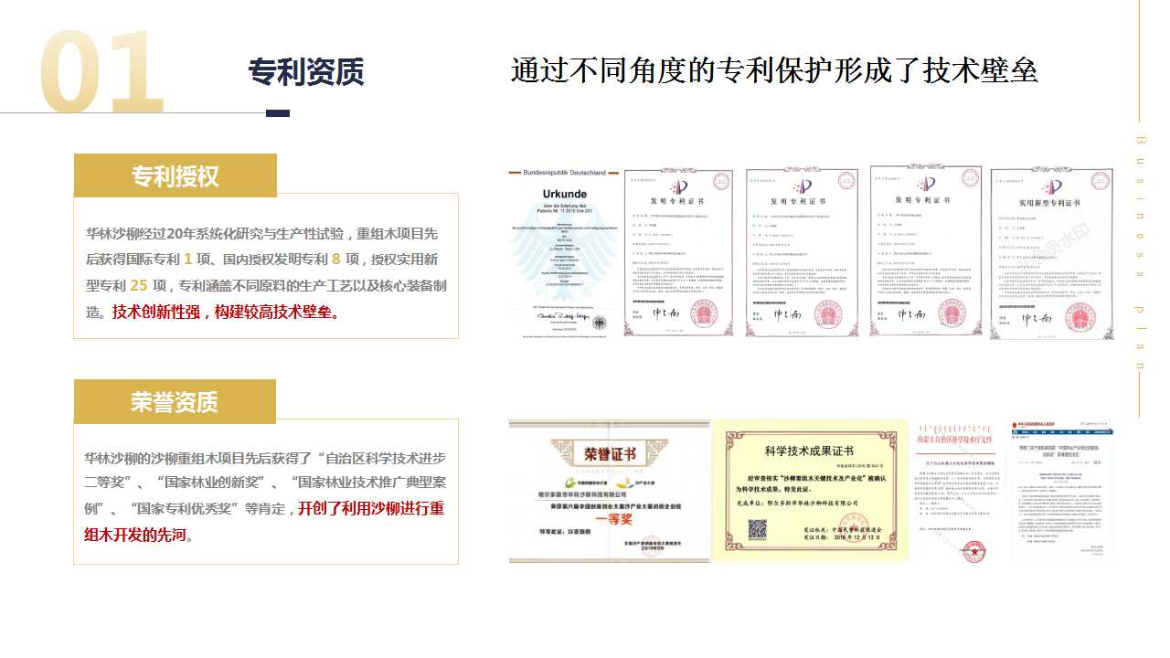 回答:重组木的工艺和传统人造板有很大的区别,设备以不一样,没有共用性;我们的专利是从两个角度进行保护的,一个是不同原料的工艺(灌木和乔木为原料)另外一个角度是成套装备;同时我们还有专有技术融合在整体生产工艺中,门槛比较高。我们目前生产的重组木有两种原料:沙柳和杨树,明年将增加桦木为原料。