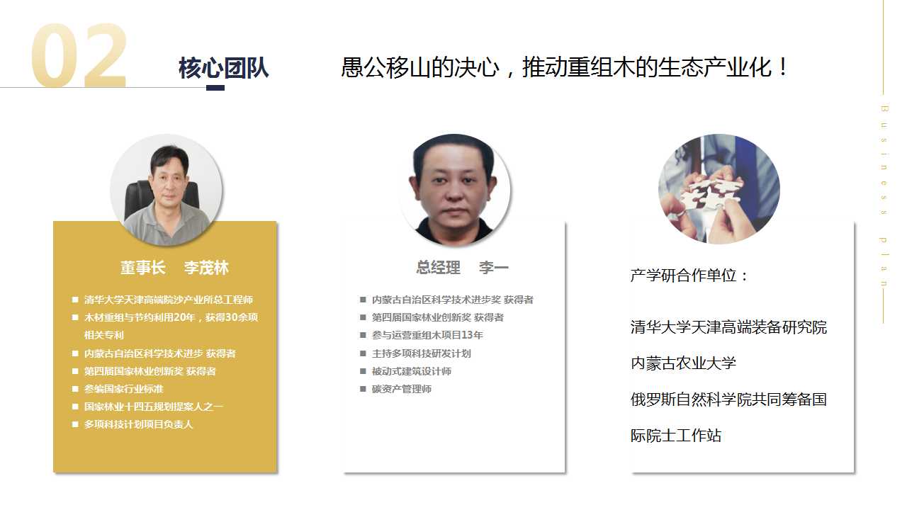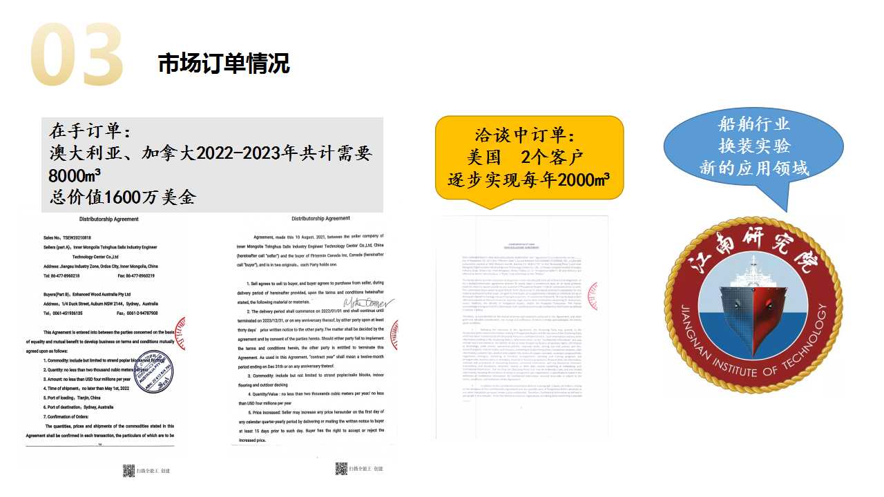 回答:江南研究院隶属于江南造船厂,每年造船的数量占据着全球40%的市场份额,同时是军管企业,江南研究院是造船厂研发创新机构,我们的合作就是要把重组木带到船舶制造和船舶维修行业,目前我们正在进行船舶行业中《欧盟公约》要求的材料安全性检测,检测结果为所未检出有害性物质,接下来就可以进行船舶上部分材料的换装实验了,进入江南造船厂对于重组木来讲是一个里程碑,他对于材料的性价比是一个很好的说明,我们针对船舶行业主要是销售木材,针对出口主要是大规格室内室外地板,不同的产品有不同的渠道和营销方式;成为小巨人,我们还需要补充专业的管理和运营团队,建立股权机制,激励团队成员共同推动生态产业化的发展。